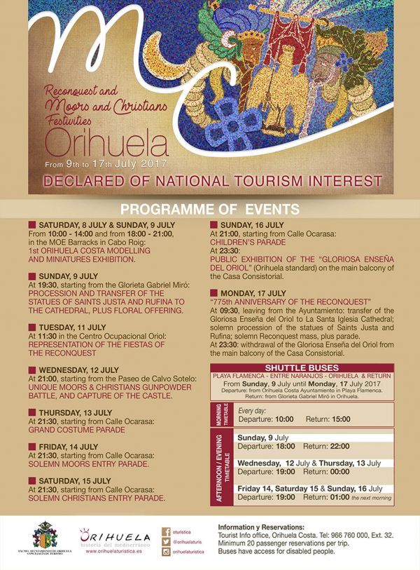 The second starts on Sunday and lasts all week. The Moors and Christians Festival in Orihuela City. Transport provided from the Town Hall