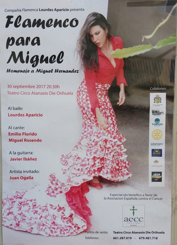 FLAMENCO SHOW TO MIGUEL HERNÁNDEZ: on Saturday, September 30th at 8.30 pm at the Theatre of Orihuela (Teatro Circo) there will be a flamenco show, homage to the Poet Miguel Hernández. It will be in aid of the AECC.