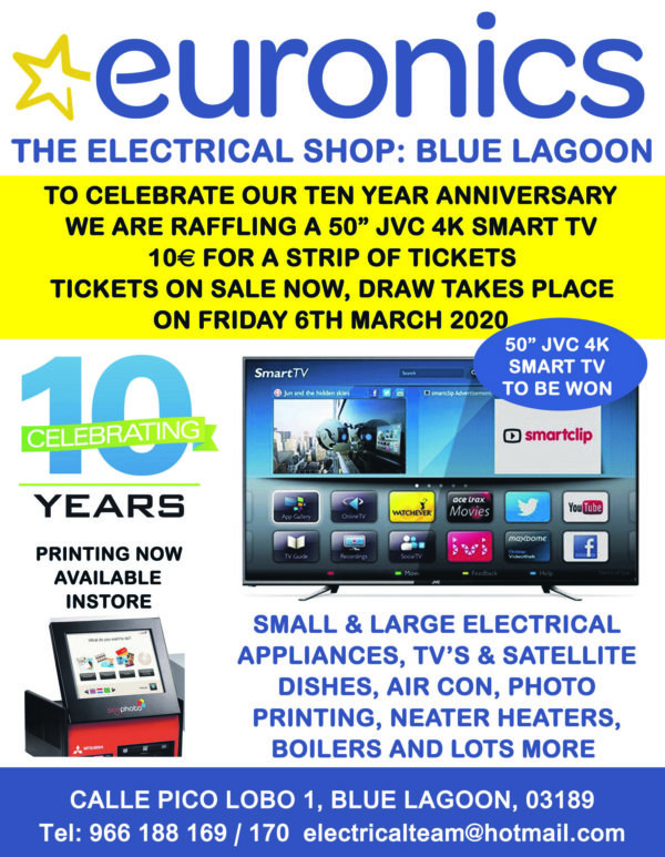 Coming up this March, is the Euronics showroom 10th anniversary and to commemorate the occasion a 50 inch J.V.C. 4k tv is up for grabs. Pop into the showroom for details.