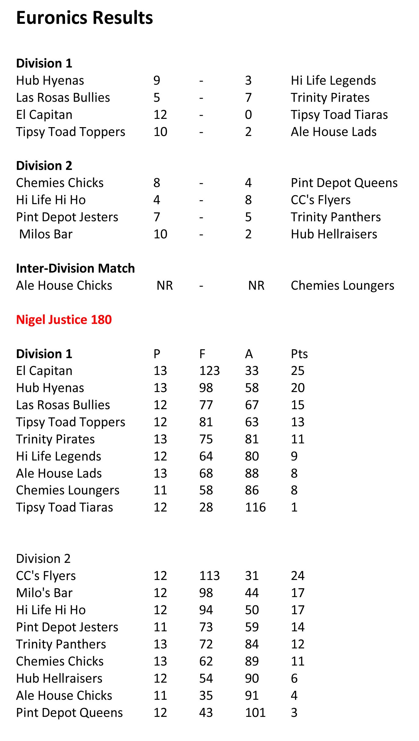 A wake-up call for the Capitanos, they quickly despensed with the ladies all the way until the Lithuanian stew arrived. I don’t know the recipe but it sure does the trick for the homeside as not a drop was left when they opened up for the singles. Tiara Wendy Hayward (117) gave good account of herself but Shane – minus the hat this week- Dennis (119) took the lads to an unasailable win.