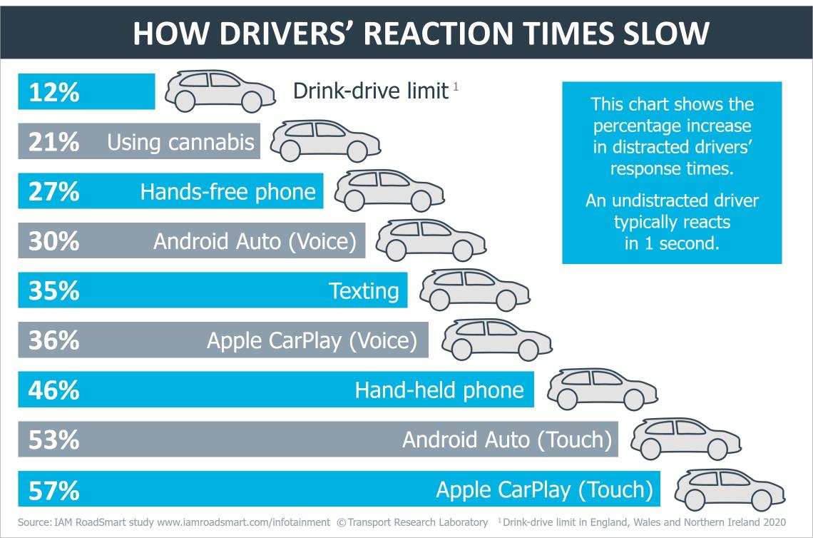 - Stopping distances, lane control and response to external stimuli all negatively affected by the use of Android Auto and Apple CarPlay