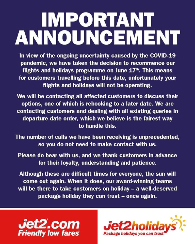 “Although these are difficult times for everyone, the sun will come out again,” said a spokesperson from Jet 2.