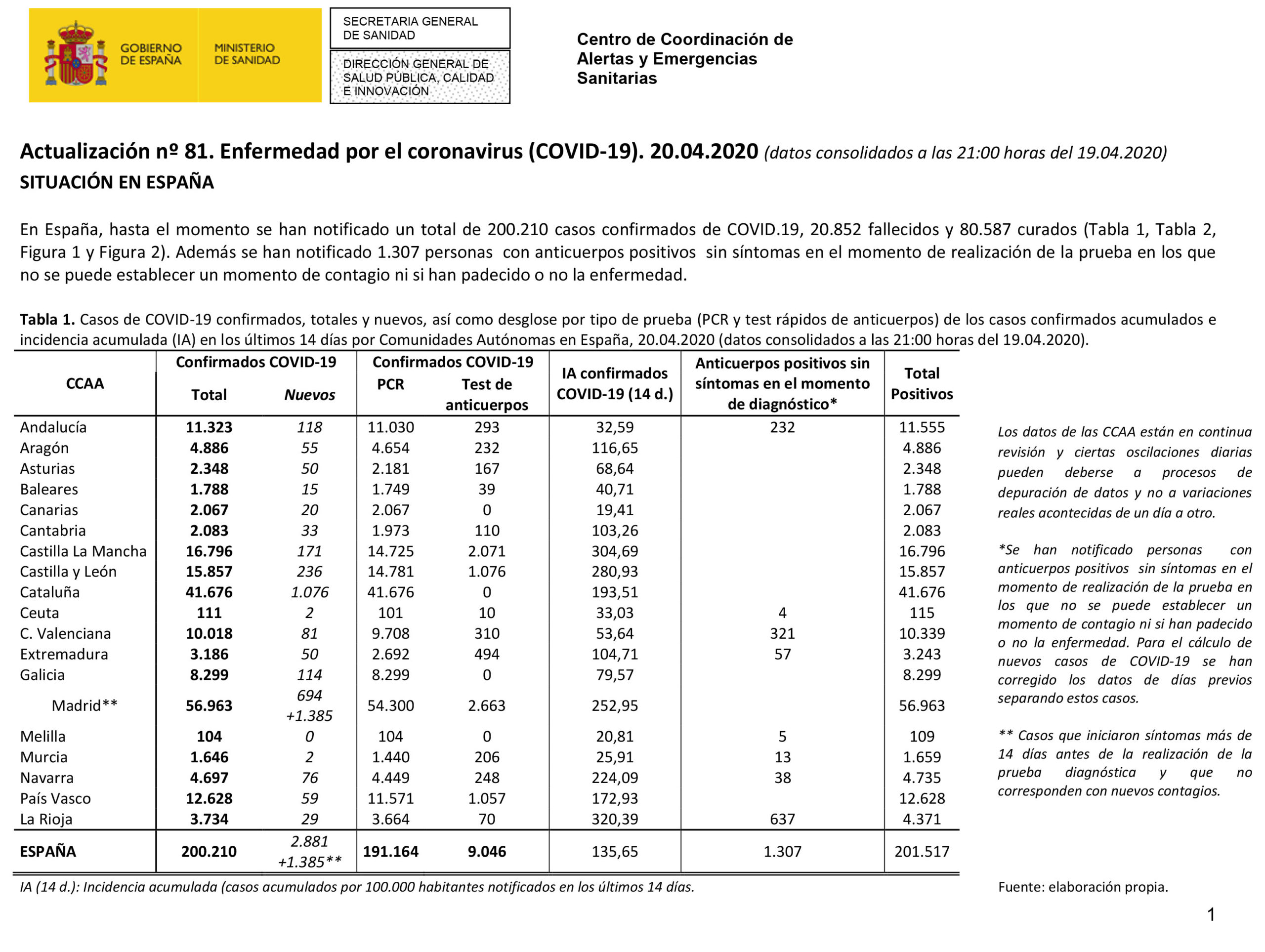 The sixth week of confinement begins in Spain with bittersweet news. The number of daily deaths has fallen to figures that have not been seen for almost a month, however, there has been an increase in the number of new cases taking the numbers past 200,000 infected in the country. What that means statistically is that one out of every 235 Spaniards has tested positive for the Covid-19, although the number of actual infected is probably much higher.