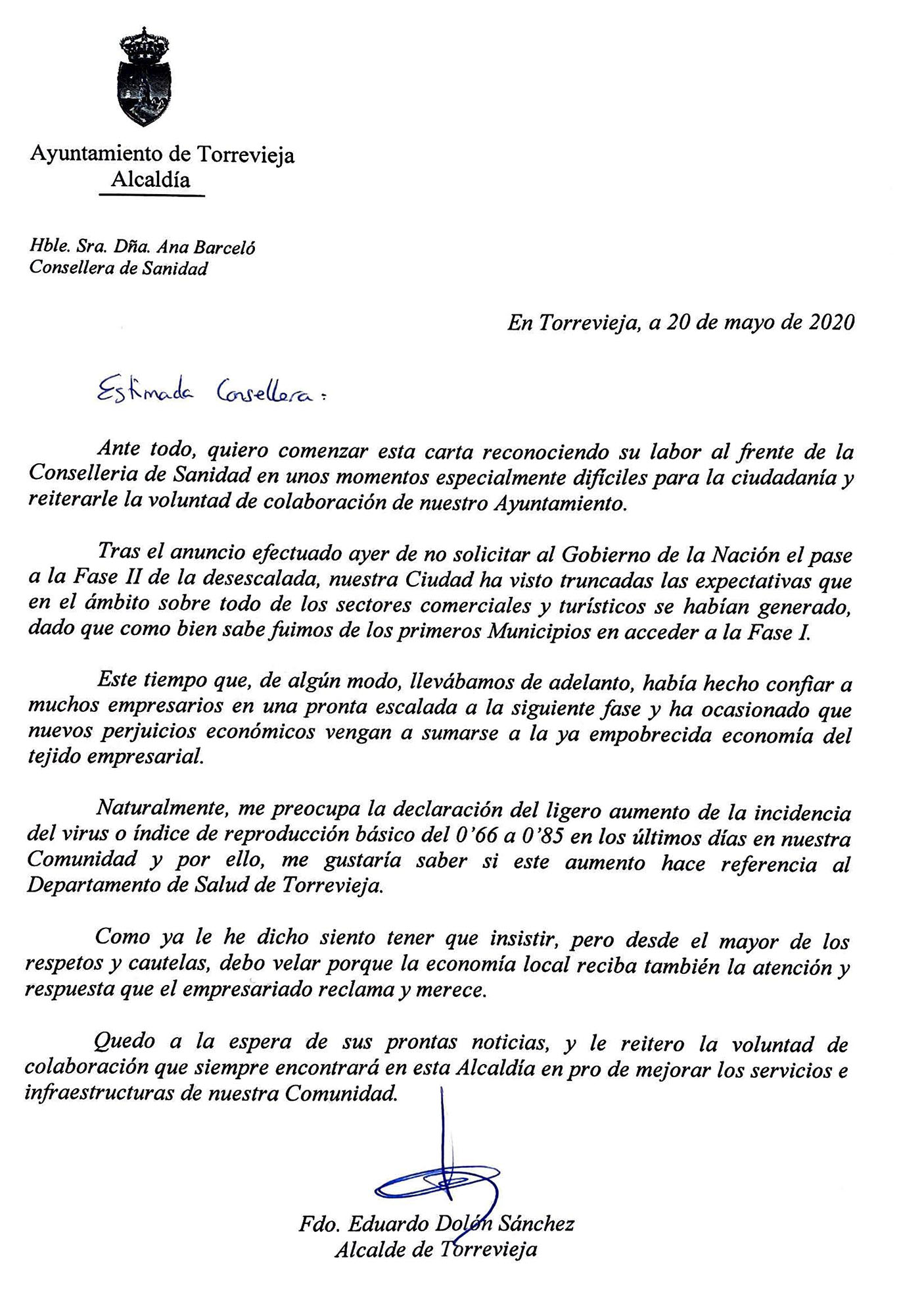 Following the announcement by the Minister of Health, Ana Barceló, that the Valencian Community will not ask to move into Phase II of the de-escalation process, scheduled for next Monday, 25 May, Mayor Eduardo Dolón, has written to the minister telling her of his regrets although he did say that he understands that prudence and security are essential in these times of crisis.