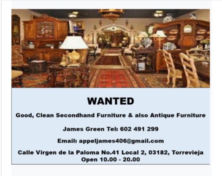 JAMES GREEN SECOND HAND FURNITURE BOUGHT & SOLD. Houses cleared. Calle Virgen de la Paloma No.41 Local 2, 03182 Torrevieja. Telephone: 602491299. Email: appeljames406@gmail.com