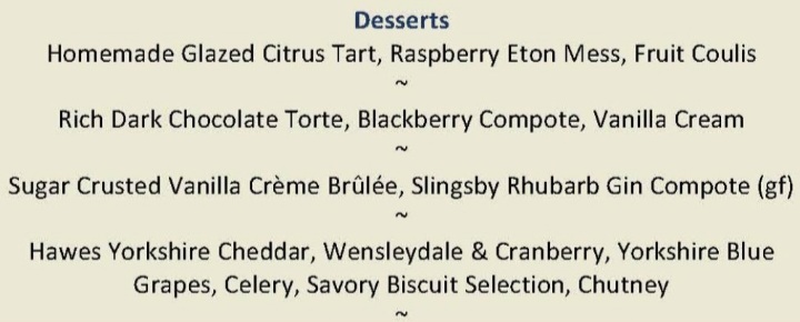 Desserts include Raspberry Eton Mess, Rich Dark chocolate Torte, Slingsby Rhubarb Gin Compote (gf), Wensleydale & Cranberry.