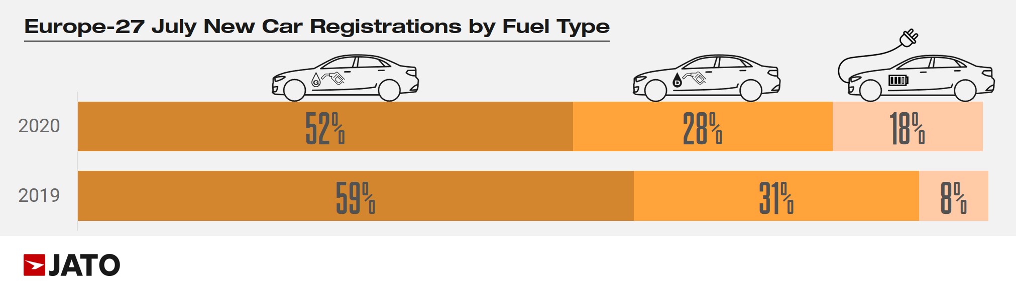 The global pandemic’s strong impact on the economy has not influenced consumer’s interest in electrified vehicles. July 2020 was a record-breaking month for EV registrations with volume up 131% year on year to 230,700 – the first time that these vehicles were bought by more than 200,00 consumers in a single month. As a consequence, EVs accounted for 18% of total registrations in July, far greater than their market share of 7.5% in July 2019, and 5.7% in July 2018. “The rise in demand for EVs is strongly related to a wider offer that is finally including more affordable choices. The higher competition amongst brands is also pushing down prices.” Munoz commented.