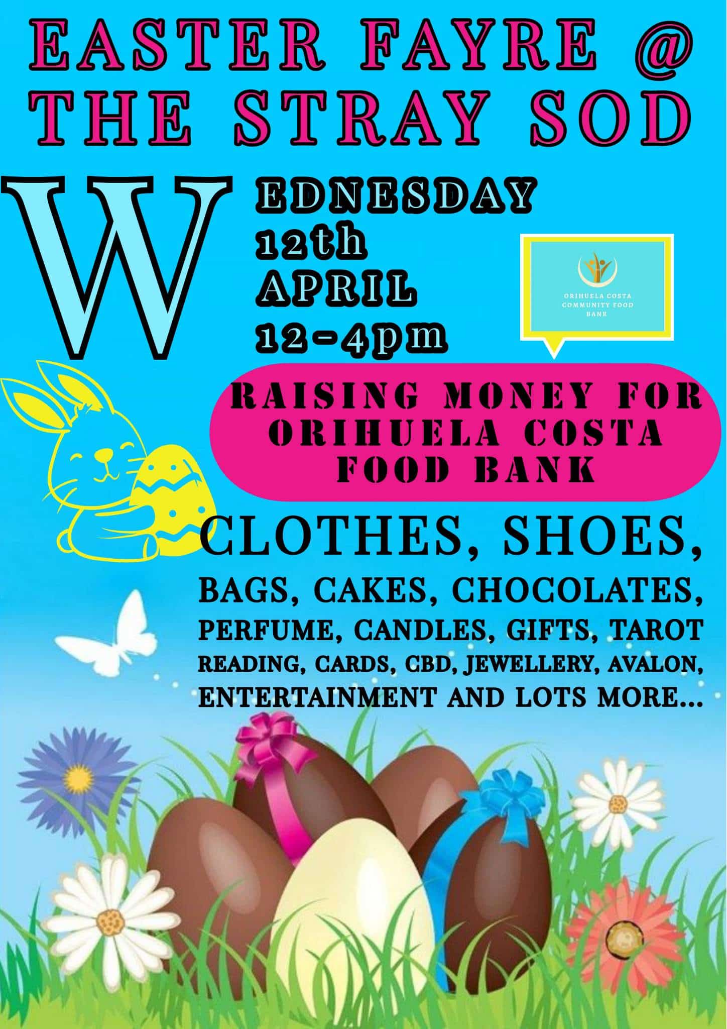 Once again, she has put her thinking cap on and this time the charity to benefit from her ideas is The Orihuela Costa Food Bank in association with Orihuela Costa Aid. An Easter Charity Fayre takes place Wednesday 12th April at The Stray Sod, La Fuente. Lots of stalls both inside and out, food, great entertainment, tombola, chocolate treats and games for the kids, large raffle and much more. There is no need to book, just turn up on the day.